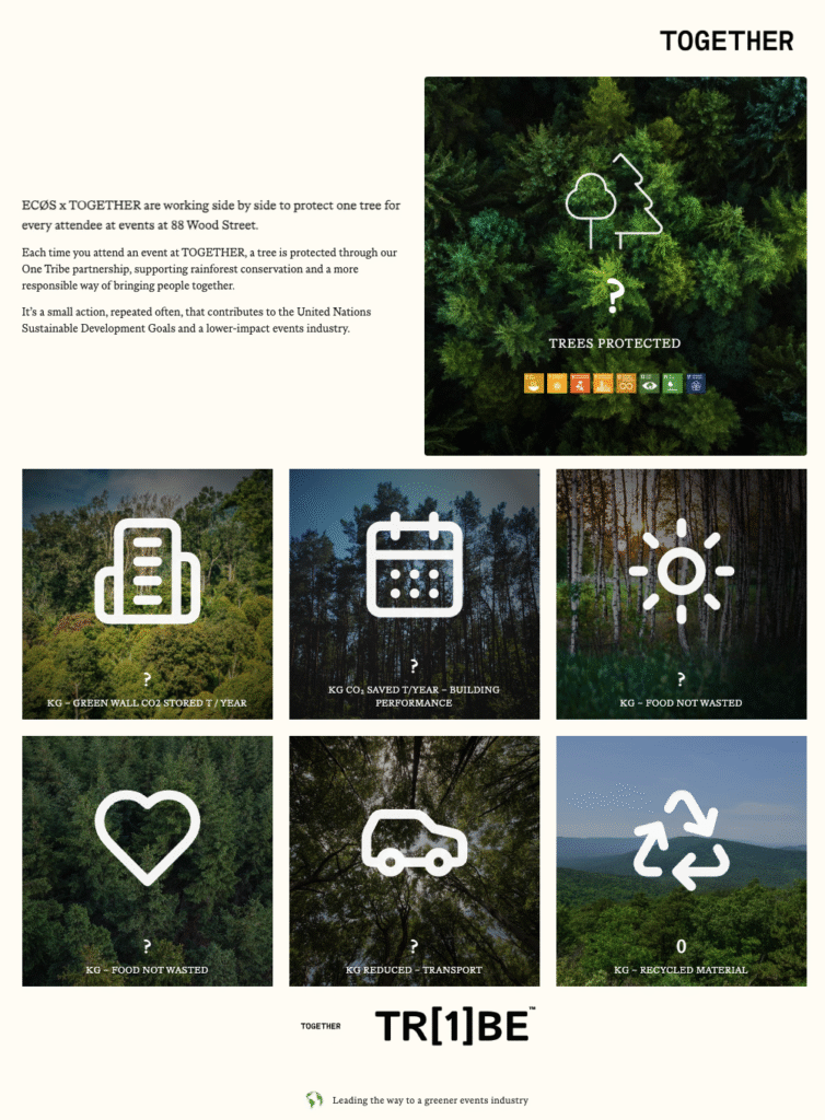 Together manages multiple event spaces across London. One Tribe gives them a single place to measure the footprint of every venue, account for it credibly, and demonstrate improvement across their entire portfolio — with individual impact pages per space and consolidated group reporting.